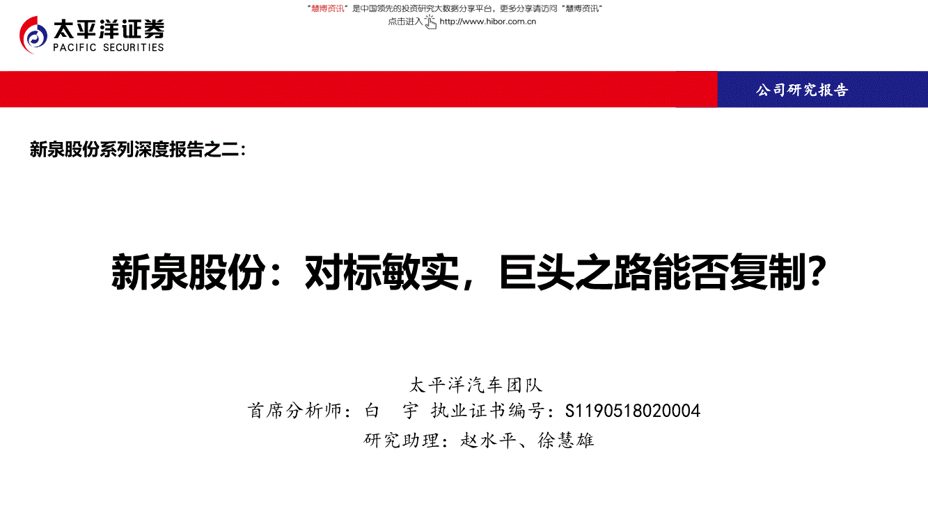 新泉股份:对标敏实,巨头之路能否复制?太平洋汽车团队首席分析师:白宇执业证书编号:S04公司研究报告新泉股份系列深度报告之二:研究助理:赵水平、徐慧雄PPT模板下载:/moban/ 行业PPT模板:/hangye/ 节日PPT模板:/jieri/ PPT素材下载:/sucai/PPT背景图片:/beijing/ PPT图表下载:/tubiao/ 优秀PPT下载:/xiazai/ PPT教程:/powerpoint/ Word教程:/word/ Excel教程:/excel/ 资料下载:/ziliao/ PPT课件下载:/kejian/ 范文下载:/fanwen/ 试卷下载:/shiti/ 教案下载:/jiaoan/ PPT论坛:目录全面对比敏实,探寻巨头成长之路内饰VS外饰,巨量规模下的格局涌动量价齐升之下,静候新一代巨头诞生投资建议与风险提示1 2 3 4PPT模板下载:/moban/ 行业PPT模板:/hangye/ 节日PPT模板:/jieri/ PPT素材下载:/sucai/PPT背景图片:/beijing/ PPT图表下载:/tubiao/ 优秀PPT下载:/xiazai/ PPT教程:/powerpoint/ Word教程:/word/ Excel教程:/excel/ 资料下载:/ziliao/ PPT课件下载:/kejian/ 范文下载:/fanwen/ 试卷下载:/shiti/ 教案下载:/jiaoan/ PPT论坛:1.全面对比敏实,探寻巨头成长之路◆成长之路,客户与品类不断拓展◆创始人加持的优秀民企,股权结构稳定◆立足基业,产品业务协同拓展◆各有倚重,客户拓展志在必得◆各类财务数据全面对标成长之路,客户与品类不断拓展敏实集团成立于1992年,最初以装饰条为核心业务,后拓展至结构件、装饰件、铝产品等外饰集成供应商,为外饰领域全球巨头;已成功进入日产、丰田、本田、通用、大众、福特、宝马、奔驰等整车车企全球采购体系。