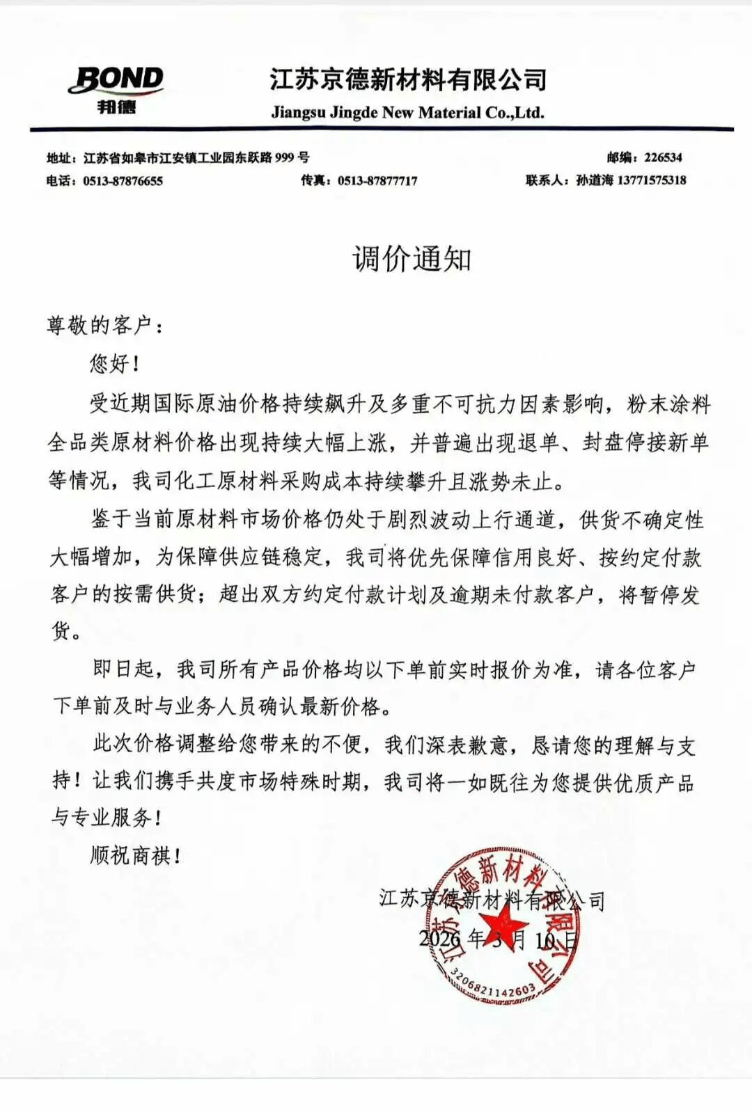 3月9日,浙江大桥油漆有限公司发布调价通知,由于国际原油价格暴涨,供货需求日趋紧张,导致化工原料价格一路飙升。公司决定从2026年3月16日下午16:30后对油漆产品上调价格,上调幅度暂定为3-5%,不排除进一步上调的可能。请各合作伙伴根据自身需求,安排好所需产品的备货,并在调价前报单给销售经理。