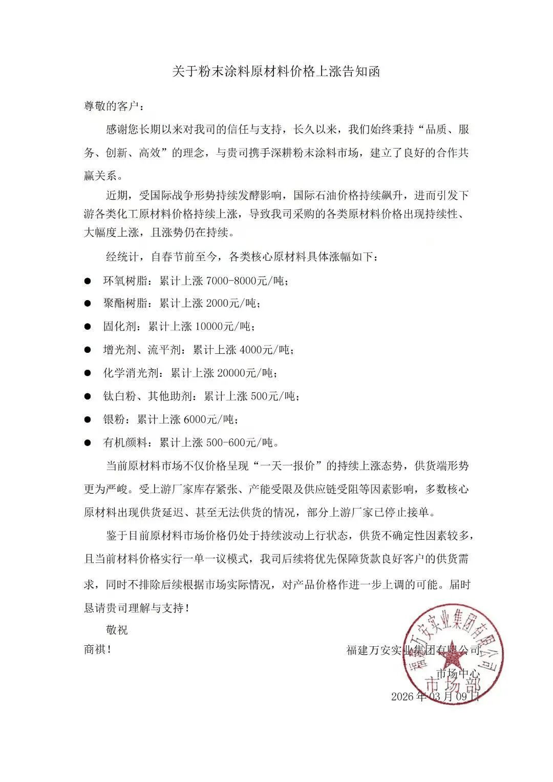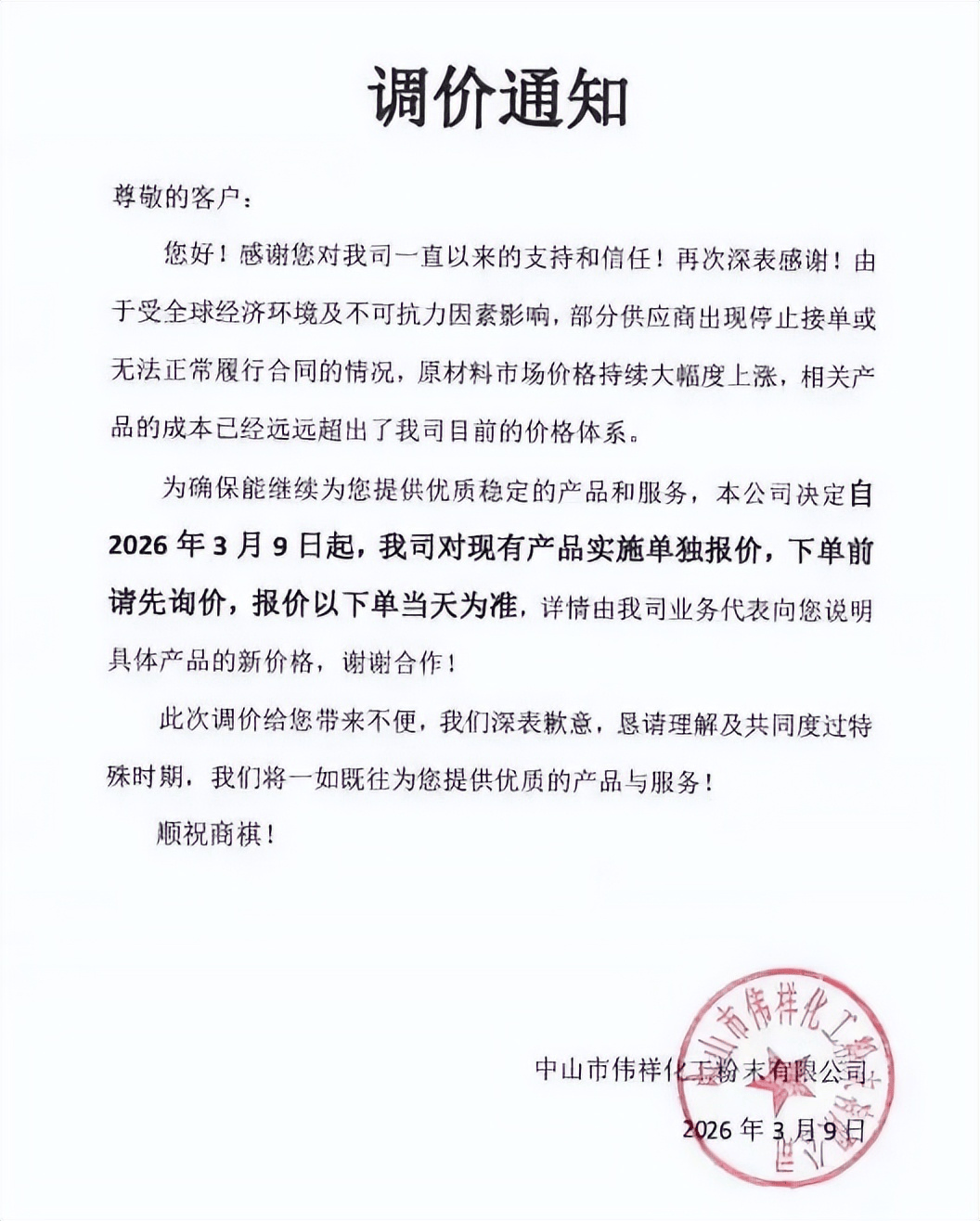 中山伟祥化工粉末有限公司发布调价通知称:为确保能继续为您提供优质稳定的产品和服务,本公司决定自2026年3月9日起,我司对现有产品实施单独报价,下单前请先询价,报价以下单当天为准。