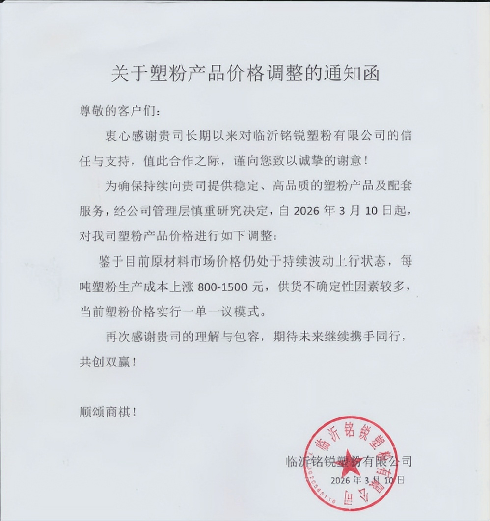 临沂铭锐塑粉有限公司发布通知称:鉴于目前原材料市场价格仍处于持续波动上行状态,每吨塑粉生产成本上涨800~1500元,供货不确定性因素较多,当前塑粉价格实行一单一议模式。
