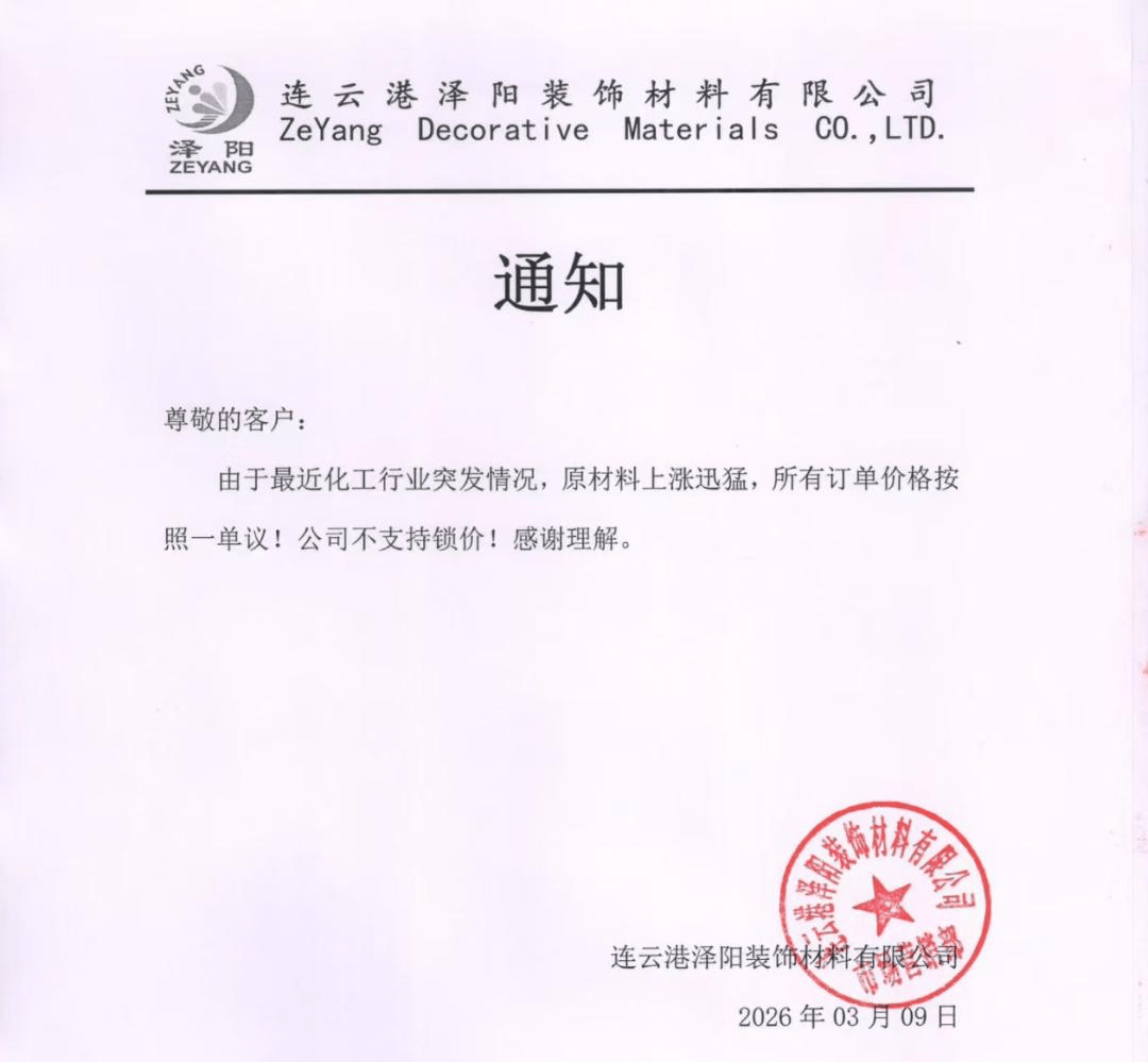 连云港泽阳装饰材料有限公司发布通知称:由于最近化工行业突发情况,原材料上涨迅猛,所有订单价格按照一单一议,公司不支持锁价。
