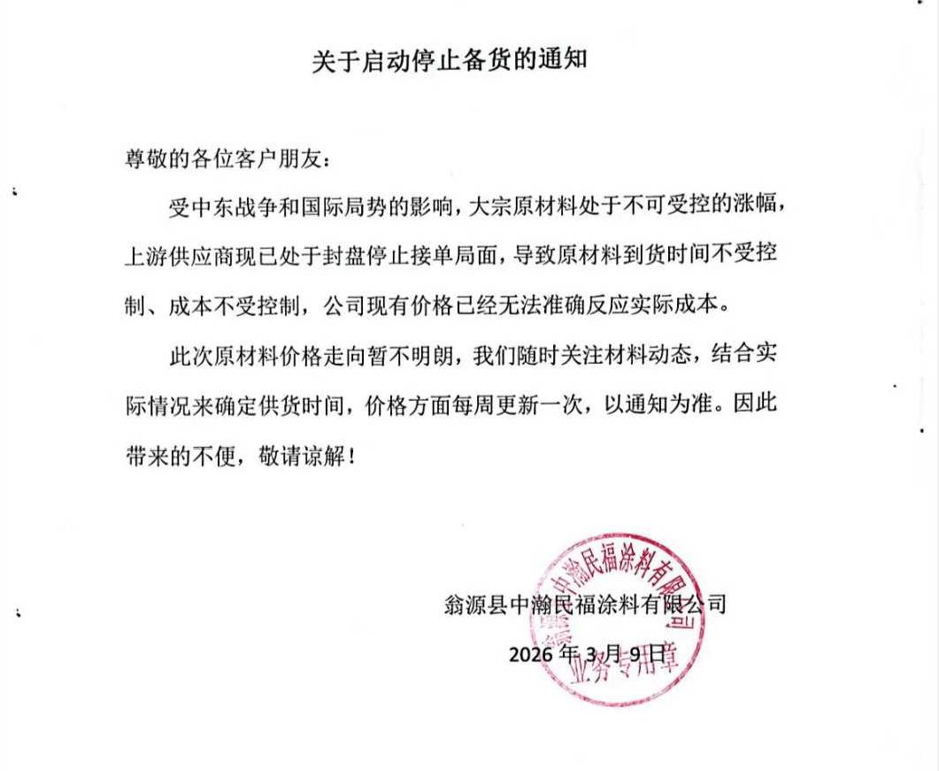 翁源县中瀚民福涂料有限公司发布《关于启动停止备货的通知》称:受中东战争和国际局势的影响,大宗原材料处于不可受控的涨幅,上游供应商已处于封盘停止接单局面,导致原材料到货时间不受控制,成本不受控制。结合实际情况来确定供货时间,价格方面每周更新一次。
