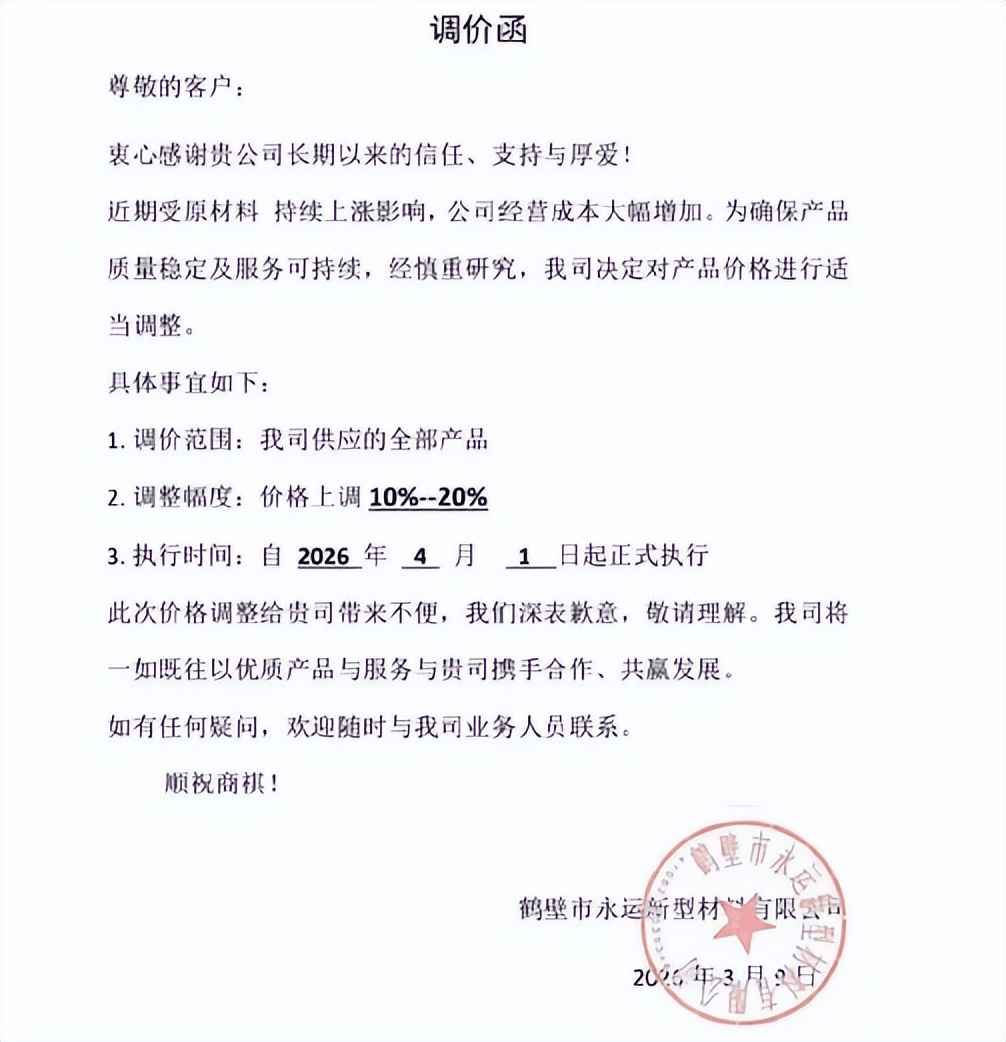 鹤壁市永运新型材料有限公司发布通知称:近期受原材料持续上涨影响,公司经营成本大幅增加,为确保产品质量稳定及服务可持续,经慎重研究,我司决定对产品价格进行适当调整: