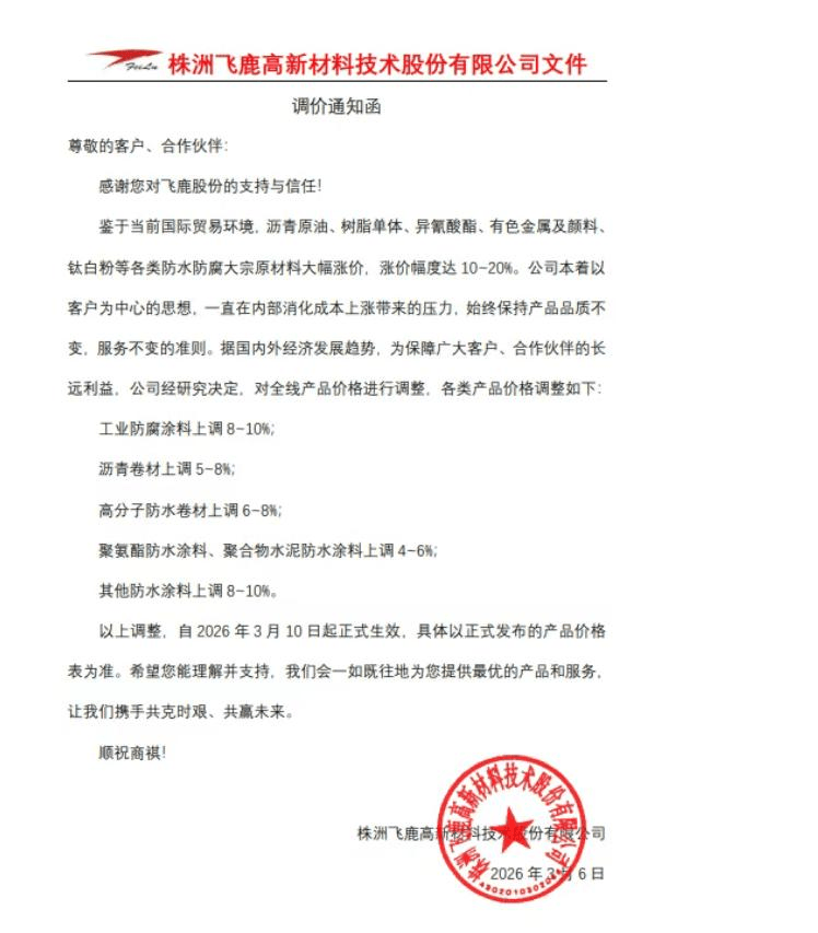株洲飞鹿高新材料技术股份有限公司发布调价通知函称,鉴于当前国际贸易环境,沥青原油、树脂单体、异氰酸酯、有色金属及颜料钛白粉等各类防水防腐大宗原材料大幅涨价,涨价幅度达10-20%。公司本着以客户为中心的思想,一直在内部消化成本上涨带来的压力,始终保持产品品质不变,服务不变的准则。据国内外经济发展趋势,为保障广大客户、合作伙伴的长远利益,公司经研究决定,自2026年3月10日起对全线产品价格进行调整,各类产品价格调整如下: