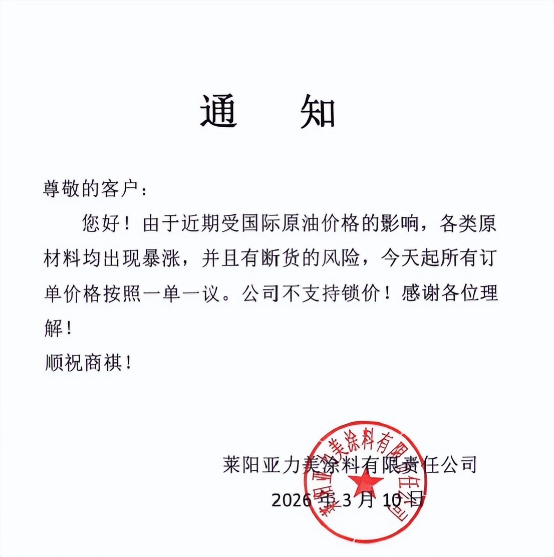 莱阳亚力美涂料有限责任公司发布通知称:由于受国际原油价格的影响,各类原材料均出现暴涨,并且有断货的风险,今天起所有订单价格按照一单一议,公司不支持锁价。