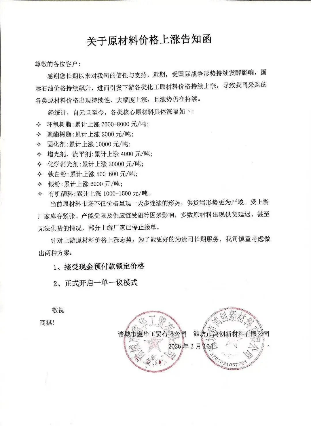 诸城市鑫华工贸有限公司、潍坊市鸿创新材料有限公司发布通知称:针对上游原材料价格上涨态势,为了更好的为贵司长期服务,我司慎重考虑做出两种方案:1、接受现金预付款锁定价格;2、正式开启一单一议模式。